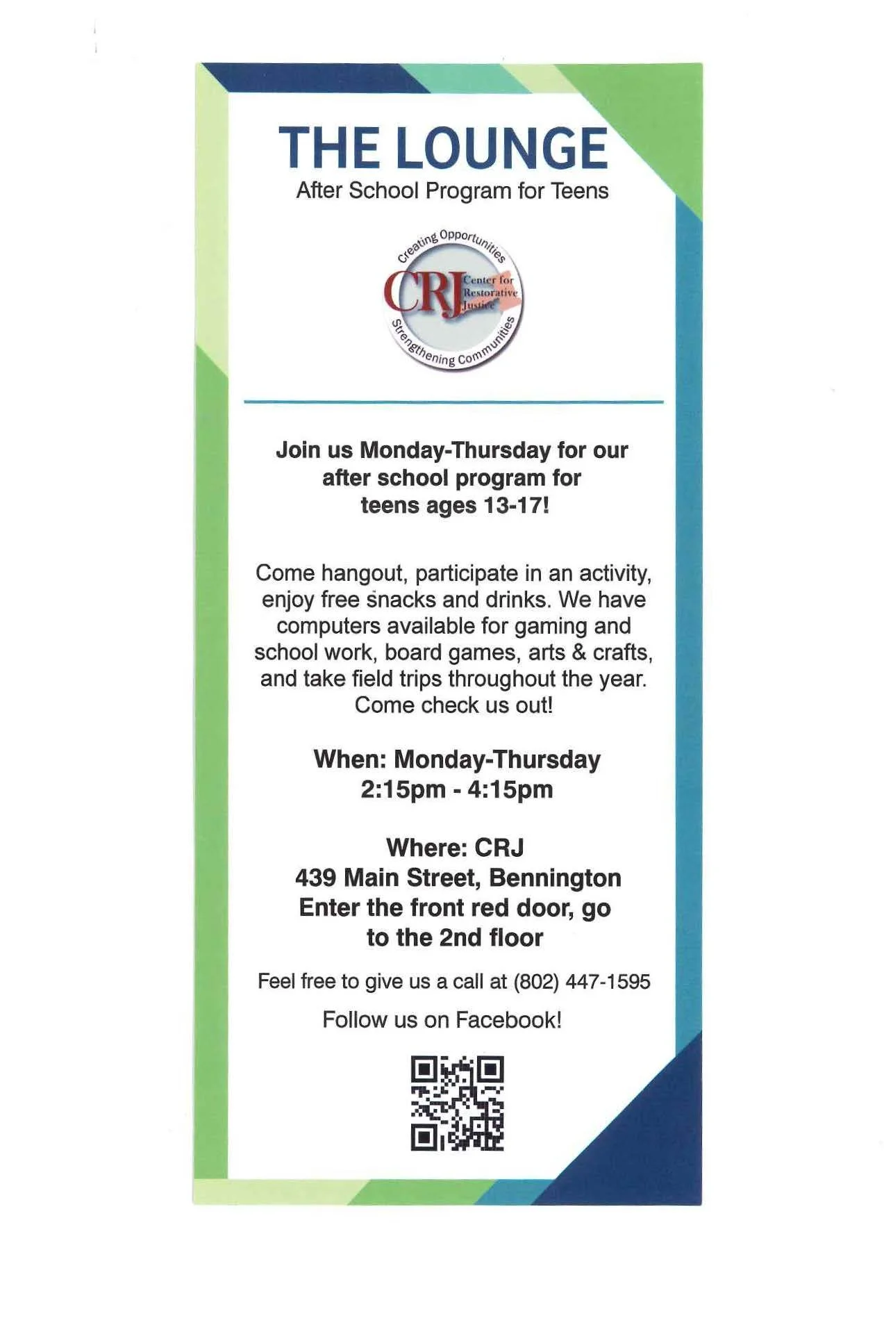 CRJ’s hosts a drop-in after school program Mondays - Thursdays, 2:15pm-4:15pm, for teens ages 13 – 17. The Lounge provides a supportive environment for youth to gather after school to hang out, meet new friends, get help with homework, engage in activities or simply chat with a caring adult about their day. All teens welcome!